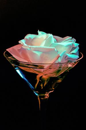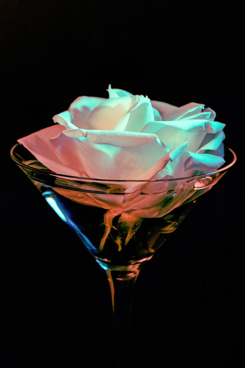 High resolution image of a Rose in a martini glass, photographed in studio with colored gels. Taken with a NikonD850.
